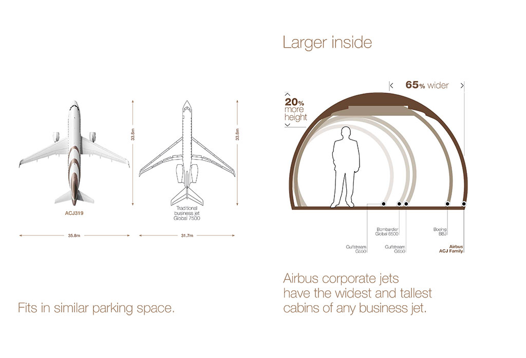 The Airbus A319 is an aircraft designed for the transport of passengers for medium-short distances. Suitable for business flights, it can accommodate up to 48 passengers. For some years now, it has also had a modular cabin known as “Elegance”. This is a “VIP” version designed for private flights that allows you to have a luxury cabin inside the fuselage in which there are beds, showers, armchairs and various types of comfort. The cabin is more than 24 meters long and 3.7 meters wide for a total height of 2.25 meters. The space dedicated to luggage is quite large and has a compartment of over 27 cubic meters. It can present different internal configurations based on customer requests and tastes.